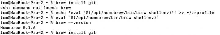 如果提示 “zsh: command not found: brew” 报错则执行下面两行修复 PATH(让 brew 命令能被找到):