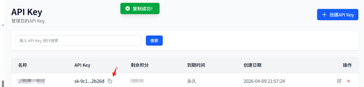 7.创建 APi key:点击 API Key 栏目,创建后复制(可以设置额度,以防 key 泄露工作流出问题导致额度刷光)