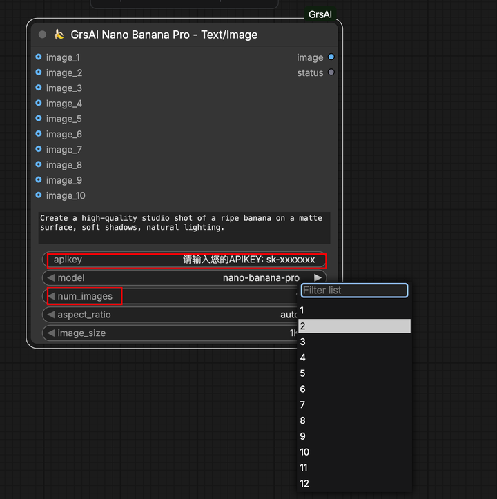8.在 comfyui 空白处右键,添加节点,找到 GrsAi,选择模型,黏贴刚才复制的 APikey 即可使用
