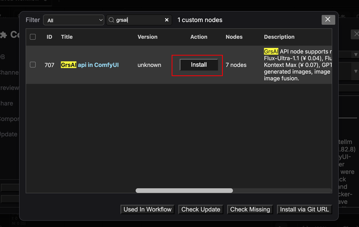 3.输入 Grsai,找到 GrsAi api in Comfyui,点击 Install 按钮安装插件