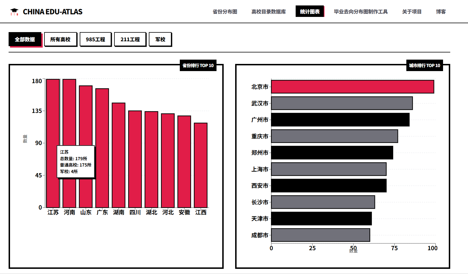 https://uni.utities.online/statistics 这是一个汇集了全国高校信息统计图表网页,是我打造的全国高校名录可视化平台的一个子功能。在这里,你可以看到各省份拥有高校数量的排行榜。