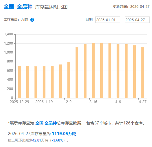 新华财经北京4月27日电钢银电商27日发布的最新数据显示,本周(截至4月27日的一周),全国37个城市,共计126个仓库的城市钢材总库存量为1119.05万吨,较上周环比减少42.81万吨,降幅3.68%。