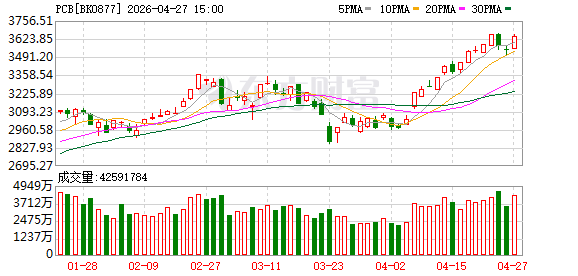 PCB(印刷电路板)板块4月27日早盘表现强势,东方材料、景旺电子、天津普林涨停;瑞华泰、德福科技、铜冠铜箔、逸豪新材、鸿仕达大涨超10%;深南电路、金安国纪、生益电子明显跟涨。