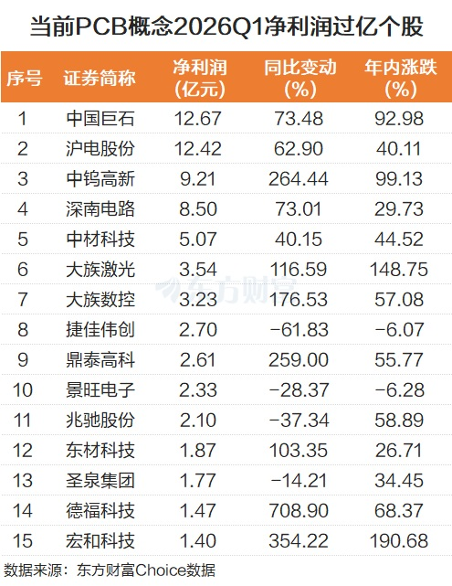 中国巨石暂居PCB概念板块“盈利王”位置,一季度实现归母净利润12.67亿元,同比增长73.48%。沪电股份一季度也盈利超过10亿元,为12.42亿元,同比增长62.9%。中钨高新、深南电路、中材科技一季度盈利则超过5亿元。