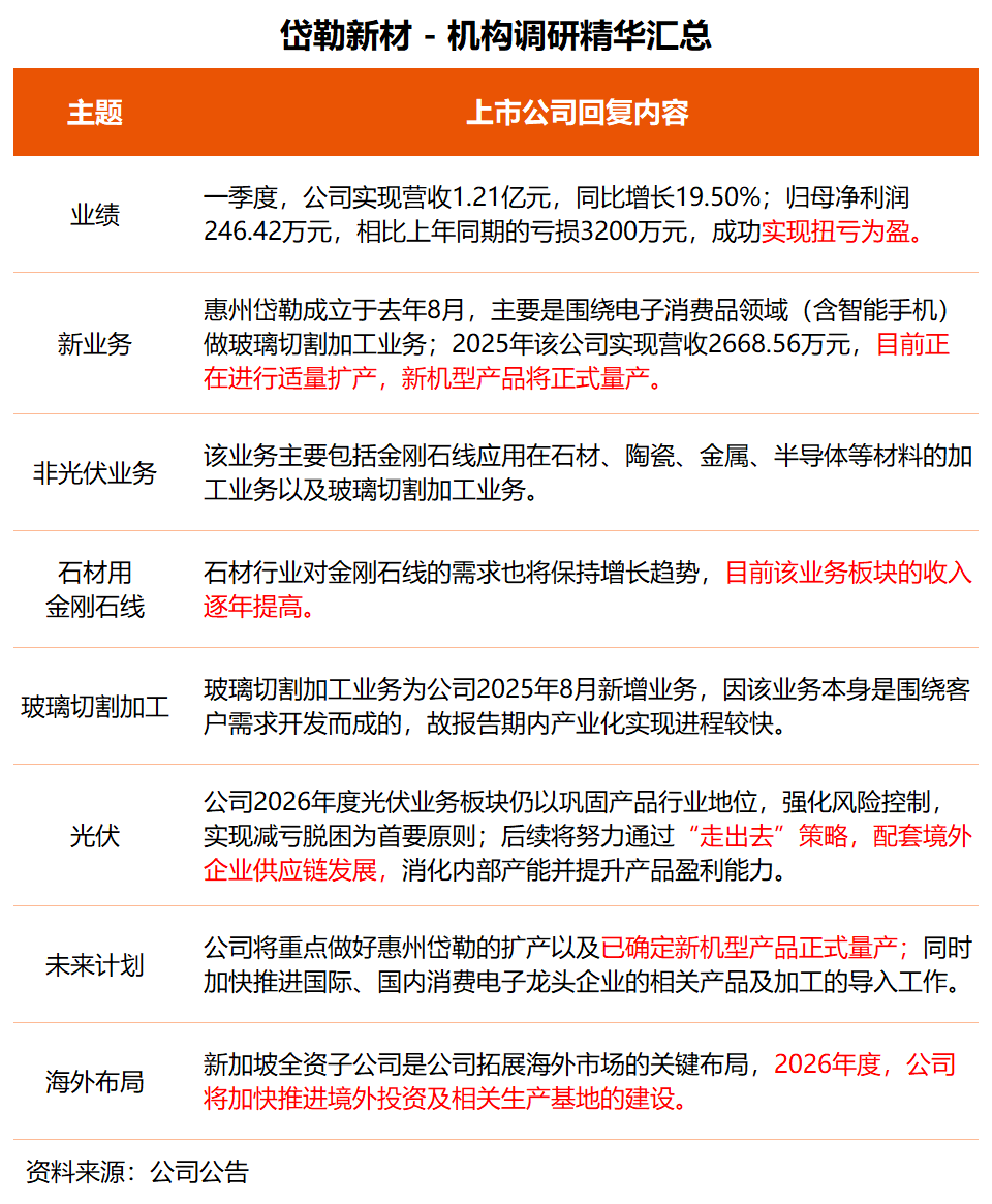 “公司非光伏板块业务收入占比已从2024年的10%提升到2025年的30%左右,且仍在持续提升。”岱勒新材称,非光伏业务主要包括金刚石线应用在石材、陶瓷、金属、半导体等材料的加工业务以及玻璃切割加工业务。其中石材用金刚石线以及玻璃切割加工业务收入在非光伏业务里占比较高。
