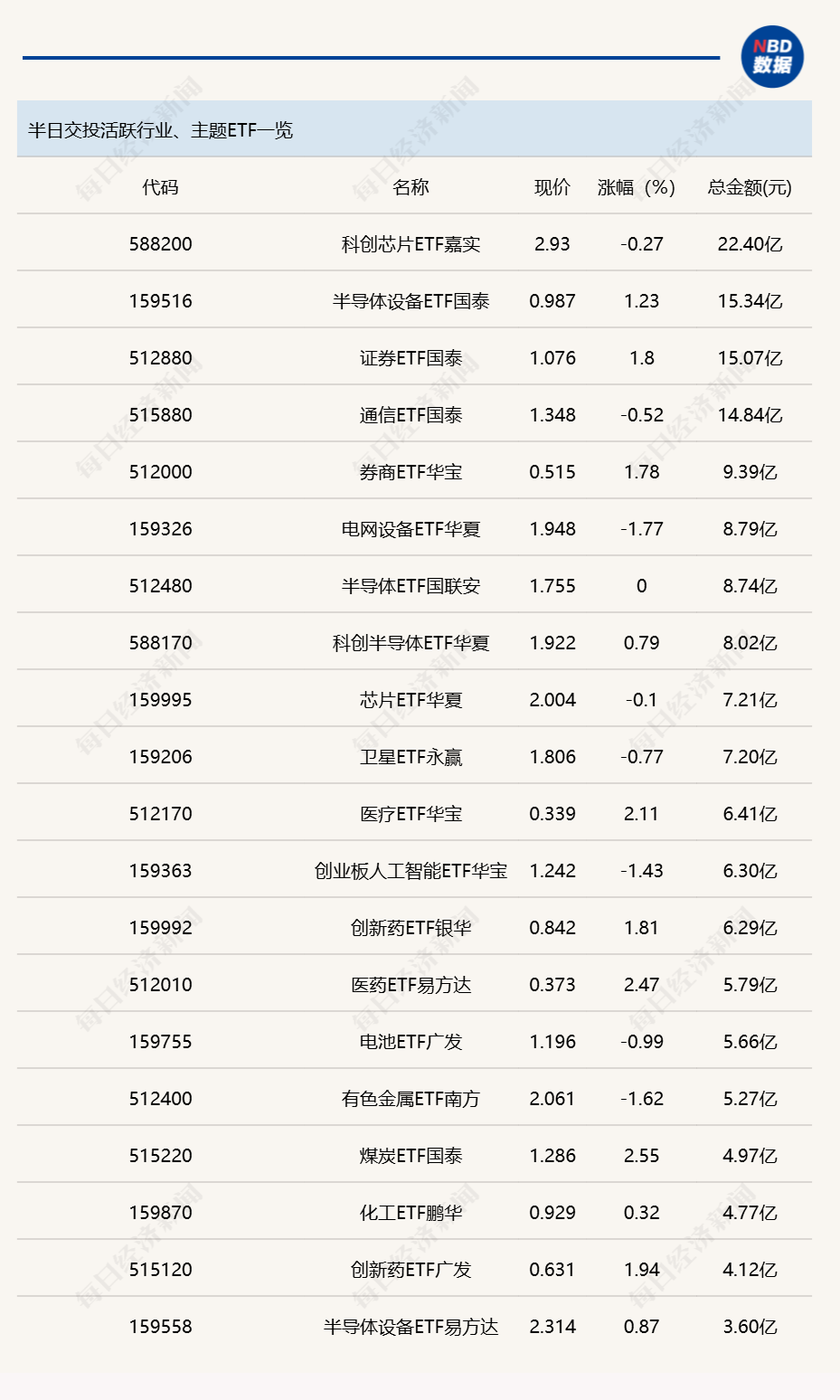 今日上午,科创芯片ETF嘉实(588200)交投保持活跃,成交金额为22.4亿元。另外,半导体设备ETF国泰(159516)和证券ETF国泰(512880)半日成交金额也超过15亿元;跨境ETF方面,中韩半导体ETF华泰柏瑞(513310)半日成交金额高达88.05亿元,再度放量大涨。