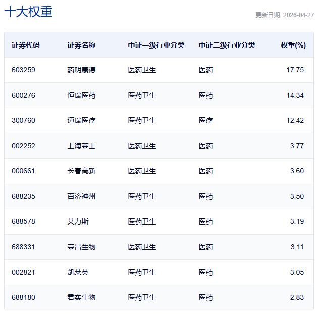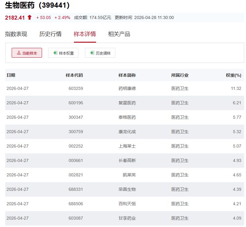 国证生物医药指数主要权重股