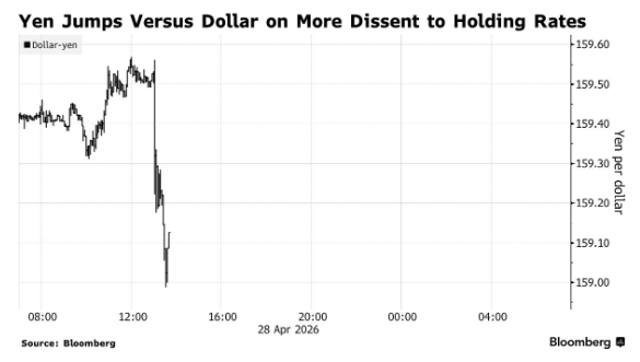 日本央行决议发布后,日元汇率大幅走强,美元兑日元汇率一度跌破159关口。