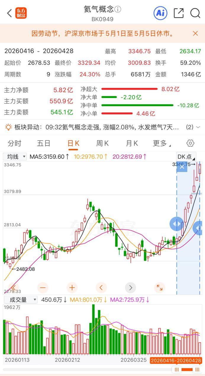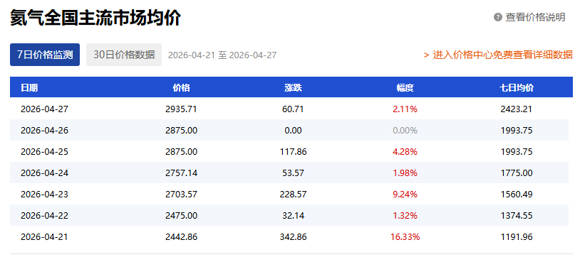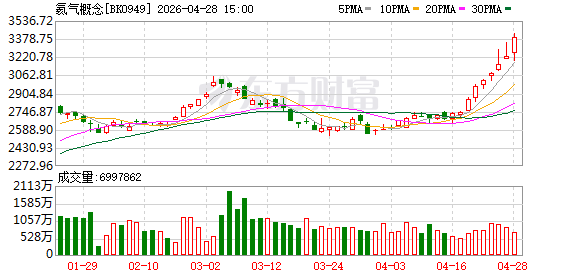 消息面上,受中东局势及俄罗斯限制出口影响,氦气近期持续涨价。据卓创资讯,4月27日,氦气全国市场主流均价报2935.71元/瓶,七日均价涨至2423.21元/瓶,较4月21日的七日均价(1191.96元/瓶)已经翻倍。