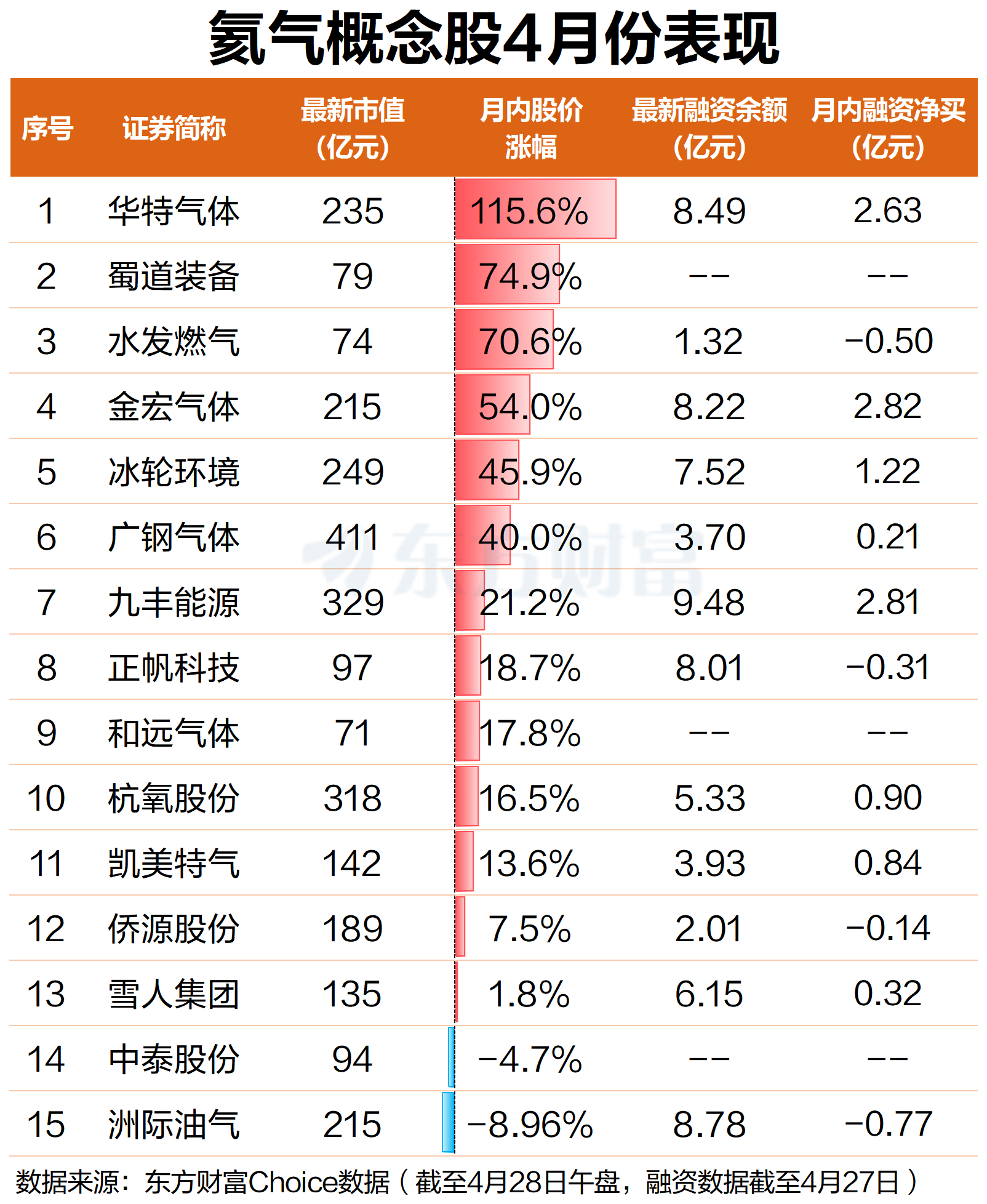 在资源稀缺性凸显的背景下,氦气概念股成为市场焦点。东方财富Choice数据显示,截至4月28日午盘,当月115只氦气概念股中有13只上涨,其中华特气体涨幅最大,月内暴涨115.6%,股价已翻倍有余。此外,蜀道装备、水发燃气涨幅居前,均超70%。