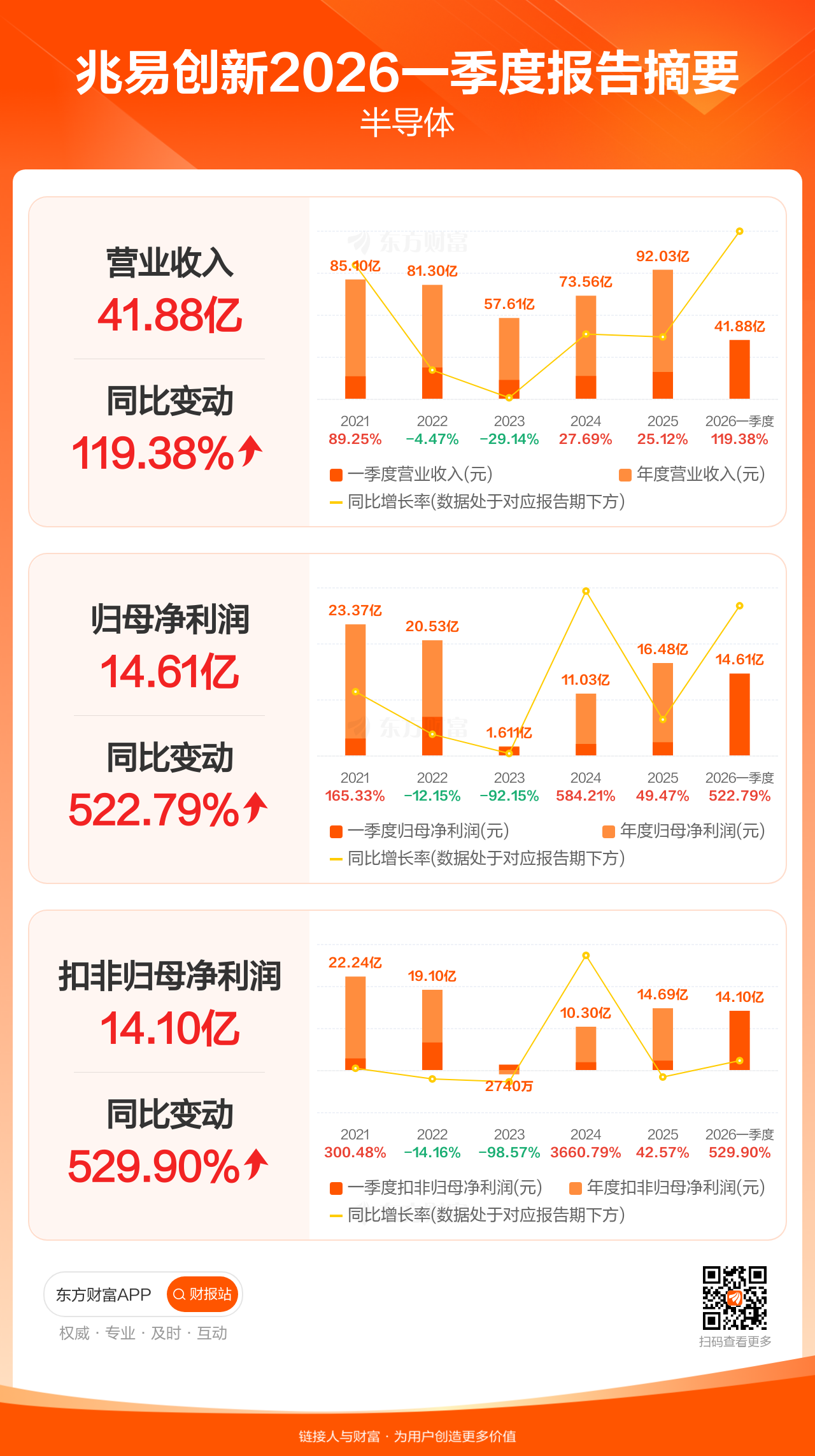 兆易创新4月30日发布2026年一季报显示,公司一季度实现营业收入41.88亿元,同比增长119.38%;归母净利润14.61亿元,同比增长522.79%;扣非归母净利润14.10亿元,同比增长529.90%。