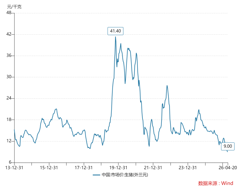观察近两年猪价走势,与2024年相比,2025年生猪(外三元)价格下降约17%,进入2026年,猪价进一步下滑。2025年全年猪价呈震荡下行态势,价格从年初的15-16元/公斤跌至四季度的11-12元/公斤。2026年猪价继续下探。据国家统计局数据,2026年1月中旬,生猪(外三元)价格为12.9元/公斤,2月下旬跌至10.8元/公斤,3月下旬每公斤跌破10元,为9.5元/公斤,4月上旬继续下跌至9.1元/公斤,4月中旬为9元/公斤。