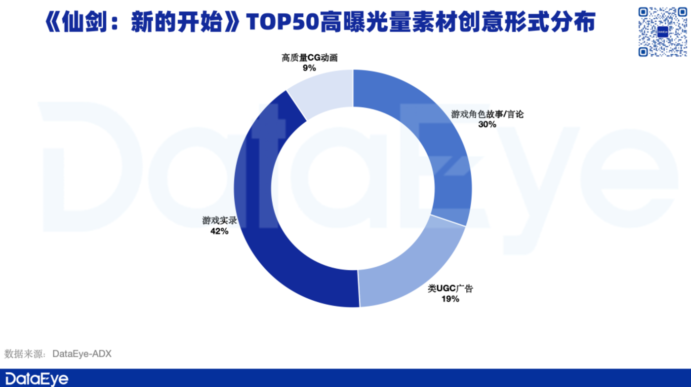 DataEye-ADX海外版数据显示,《仙剑奇侠传:新的开始》TOP50高曝光量素材的创意形式分布中,主要以“游戏实录”、“类UGC广告”以及“游戏角色故事/言论”等素材为主。