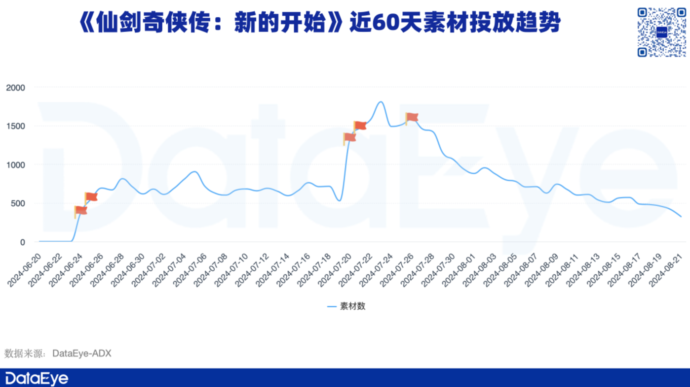 从投放素材总量来看,DataEye-ADX海外版数据显示,《仙剑奇侠传:新的开始》自今年6月份起,就开始进行素材投放,整体素材投放量已经相对突出(等同于《崩铁》投放量)。