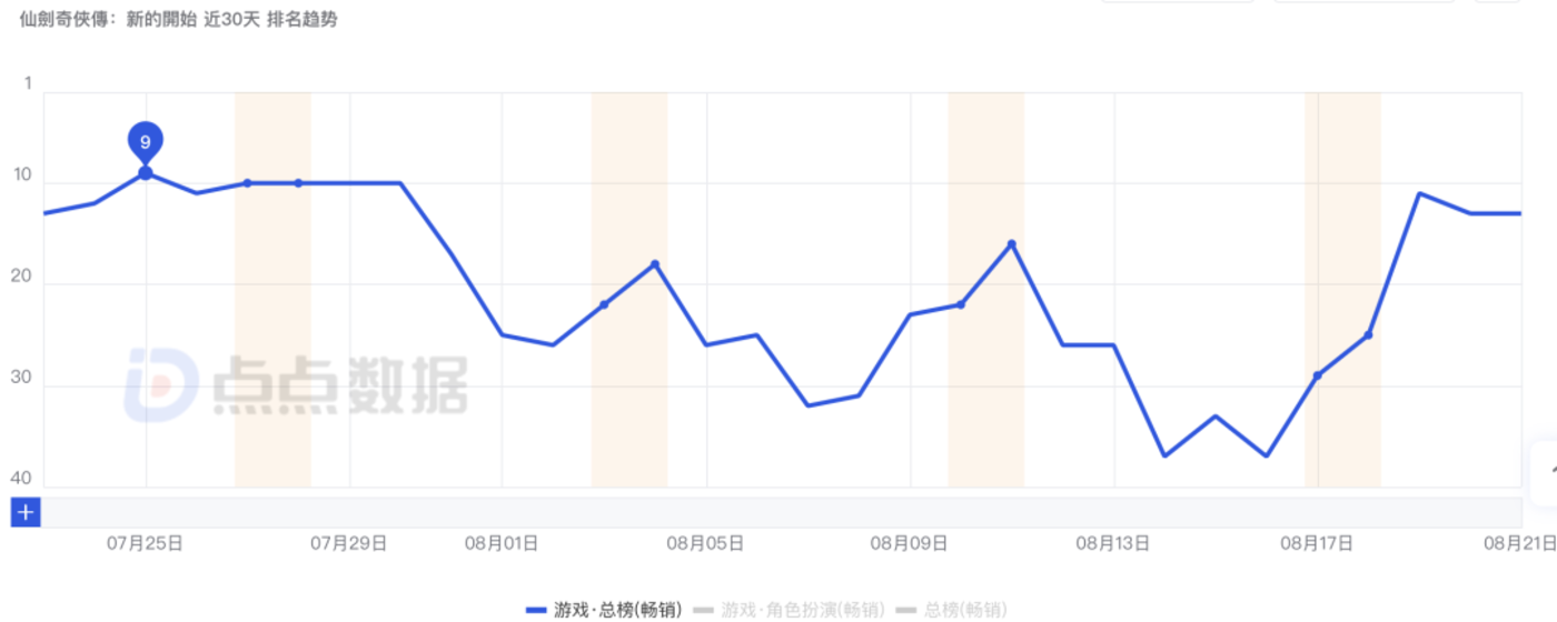 另外值得注意的是,在台湾市场iOS畅销榜中,《仙剑奇侠传:新的开始》上线一个月最低排名为37名,甚至在最近还有一波回暖趋势,重新登上iOS畅销榜TOP11的位置。