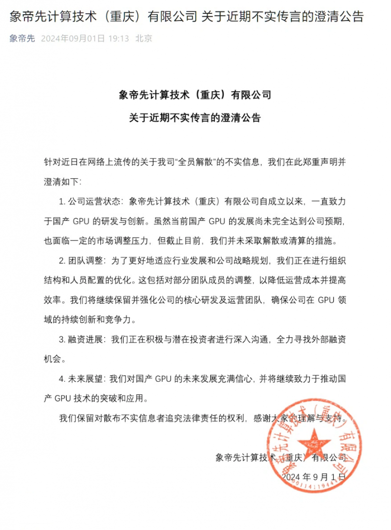 9月1日晚间,国产GPU企业象帝先通过官方公众号发布公告,针对有关“全员解散”等不实传言进行澄清。