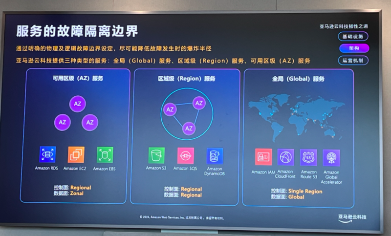 亚马逊云科技总结云服务自身韧性的四大要素:区域隔离,多可用区;控制面和数据面独立;单元架构;随机分片。