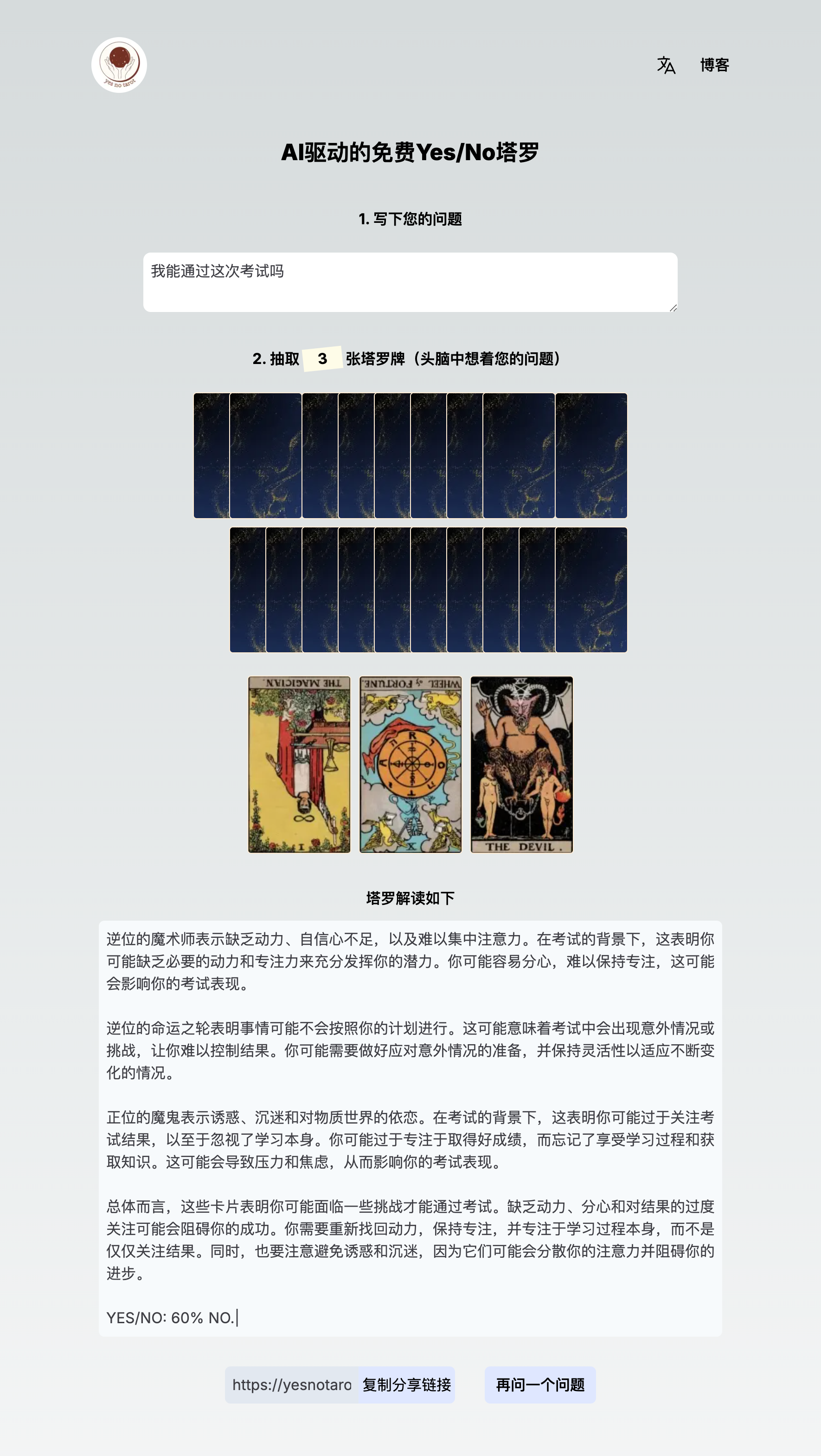 Yes/No 塔罗 AI 为用户提供即时准确的塔罗牌解读。无论您提出的是关于爱情、事业还是个人成长相关的问题,该工具都为您提供清晰且有见地的答案。该工具结合传统塔罗智慧和先进的 AI 技术,简洁清爽的界面为您良好的用户体验,清晰的解读为您带来思考与指引。