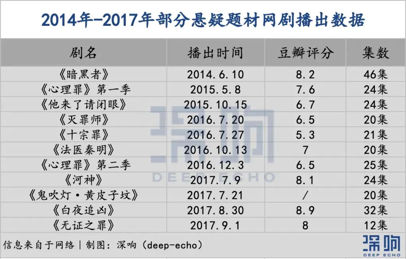 「深响」统计了2014年到2017年部分出圈的悬疑网剧,2017年可以说是悬疑剧的第一个小高峰,《河神》《白夜追凶》《无证之罪》都是当年的口碑爆款剧,豆瓣评分均在8分以上,其中在优酷播出的《白夜追凶》豆瓣评分高达8.9,刷新了悬疑网剧的评分新纪录。而他们的名字里确实带有“罪”“凶”等字眼。