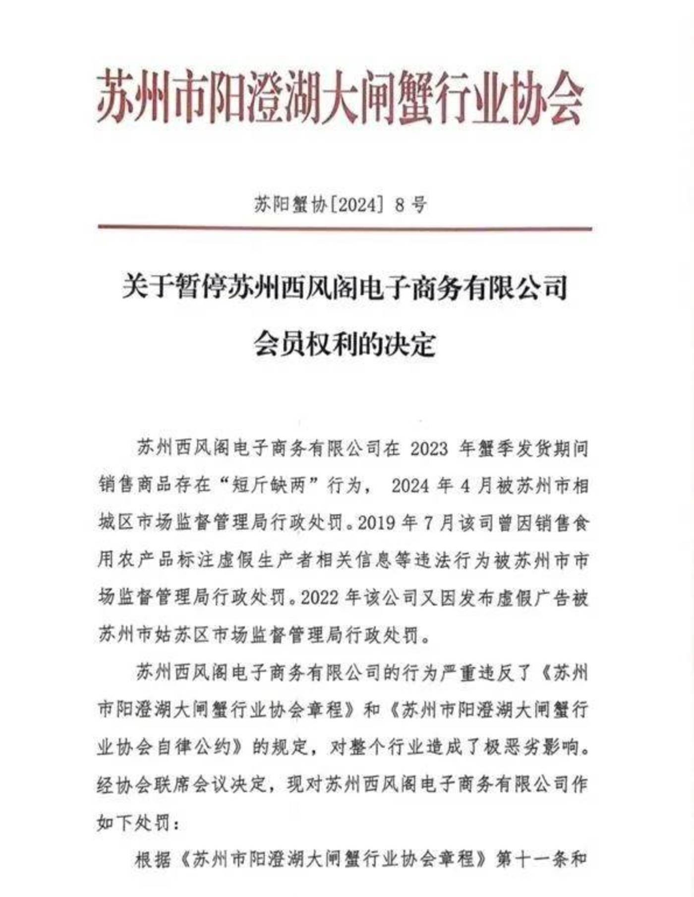 苏州市阳澄湖大闸蟹行业协会表示:“苏州西风阁的相关行为对整个行业造成了恶劣影响。经协会联席会议决定,现对苏州西风阁作如下处罚:暂停该公司2024年度会员权利,退还该公司2024年已缴会费。”