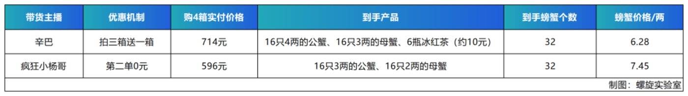 螺旋实验室同时还注意到,去年秋天蟹太太就曾经和疯狂小杨哥合作带货,当时双方主推的产品机制是199元到手8只2.5两的母蟹。