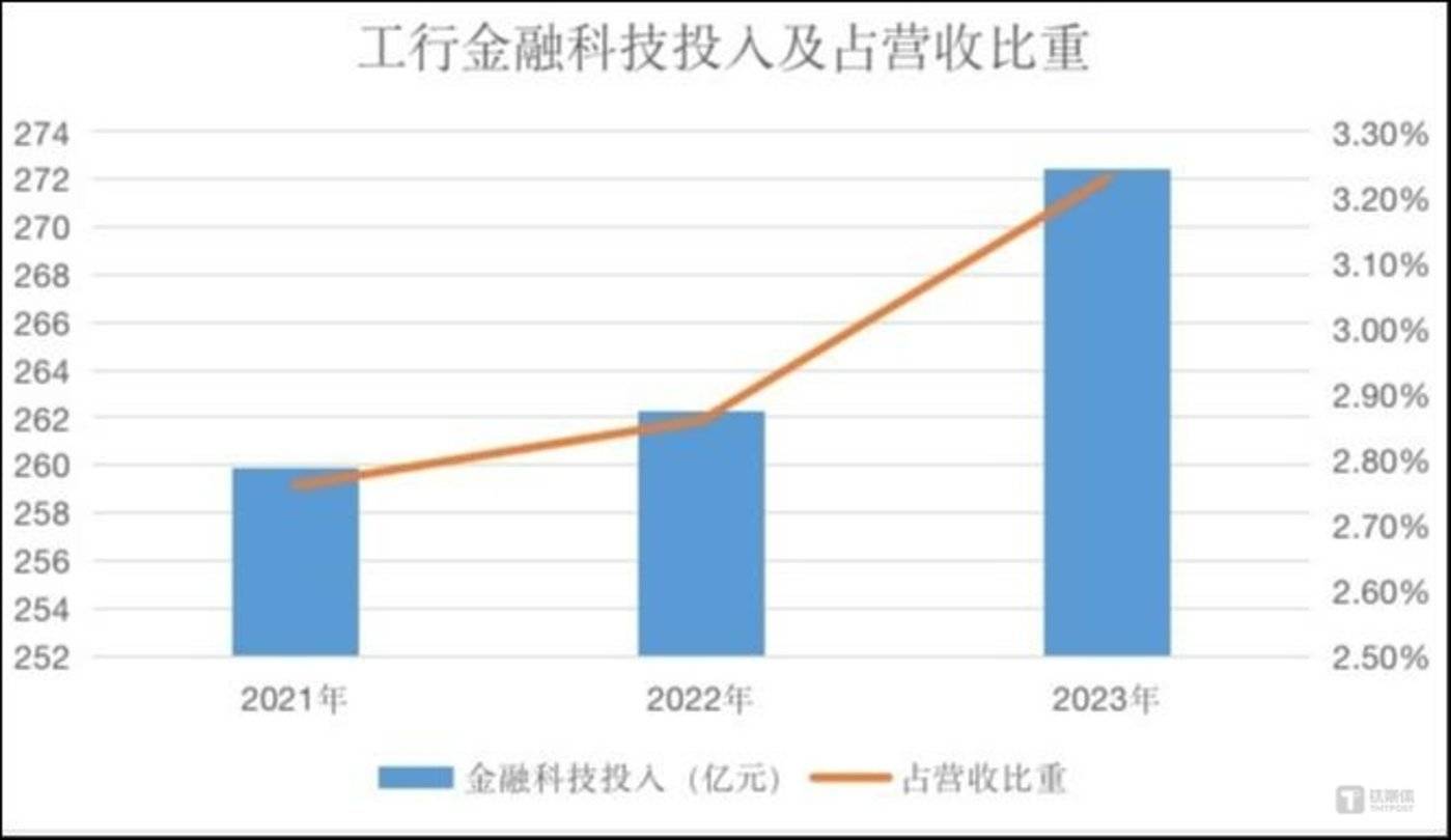 金融科技投入额度持续攀升。根据上市银行年报显示,六大行及股份制银行金融科技投入持续增长,六大行以工行最为突出,股份行以招行为代表,其中工行金融科技投入一直领先行业,2021年、2022年、2023年,工行金融科技投入分别为259.87亿元、262.24亿元、272.46亿元,分别占营收2.76%、2.86%、3.23%%。其中2023年金融科技投入较第二名建行高近22亿元。