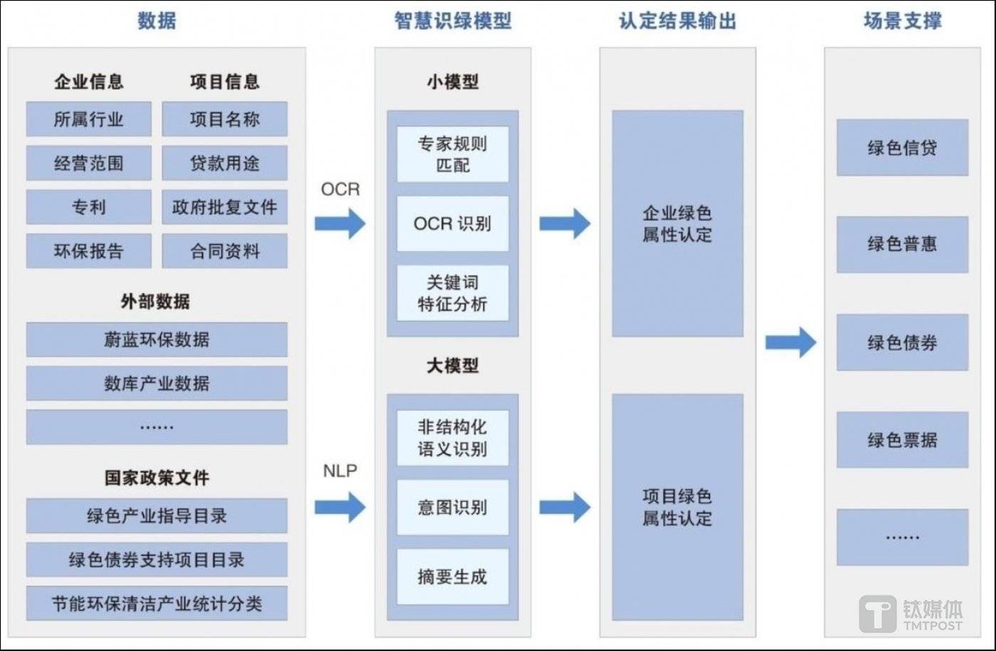 在绿色金融方面,如何判断一个项目或企业的绿色属性是发展绿色金融的难点之一,对此,工行利用其数字技术构建了“智慧识绿”体系,该体系应用该企业或项目的内外部数据,如企业或项目的信息、所属行业、环保报告、贷款用途等内部信息,融合如蔚蓝环保数据、数库产业数据等外部信息及绿色产业指导目录等国家政策文件,通过OCR、NLP等技术构建智慧识绿小模型、大模型来判断绿色企业或项目等认定,并将认定结果应用于绿色信贷、绿色债券等多个绿色金融场景。