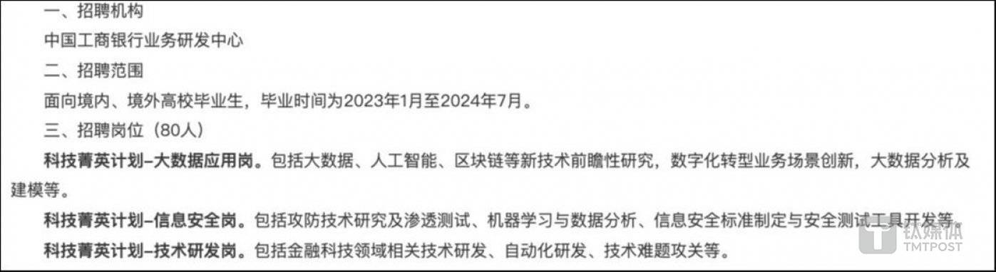 科技人员扩张之路并未停止。比如,上半年,工行业务研发中心发布2024年度春季校园招聘公告,公告显示该行科技菁英计划就大数据应用岗、信息安全岗、技术研发岗招聘80人,其中大数据应用岗包括大数据、人工智能、区块链等新技术前瞻性研究,数字化转型业务场景创新,大数据分析及建模等;信息安全岗包括攻防技术研究及渗透测试、机器学习与数据分析、信息安全标准制定与安全测试工具开发等;技术研发岗包括金融科技领域相关技术研发、自动化研发、技术难题攻关等。