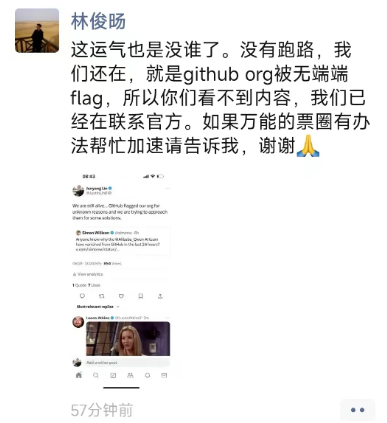 他表示:“这运气也是没谁了。没有跑路,我们还在,就是github org被无端端flag,所以你们看不到内容。我们已经在联系官方,希望尽快解决问题。如果万能的票圈有办法帮忙加速请告诉我,谢谢。”