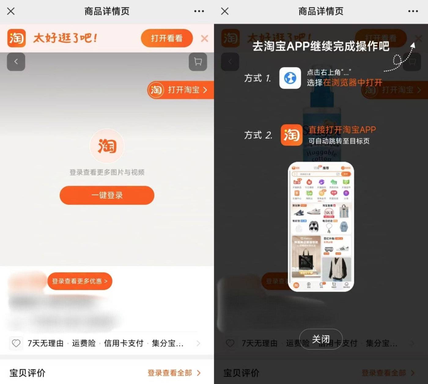 但相比拼多多、京东那些基于微信API开发的H5链接或直接显示小程序,用户只需要点开聊天框中的商品卡片,就能直接看到商品信息,还能直接跳转APP;想在微信中打开淘宝还是限制重重:在微信打开淘宝链接后,还要输入淘宝账号重新登陆,更别说直接跳转淘宝APP。