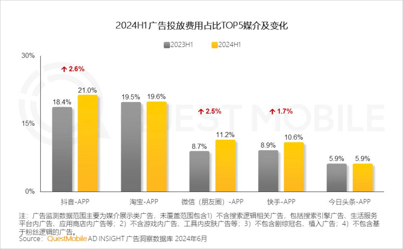 虽然最终交易还是落在淘宝,但随着微信初步开放,品牌商家也愈加重视在微信进行营销和推广。单看今年上半年不同媒介的广告投放费用占比,微信仅朋友圈就增长了2.5%。