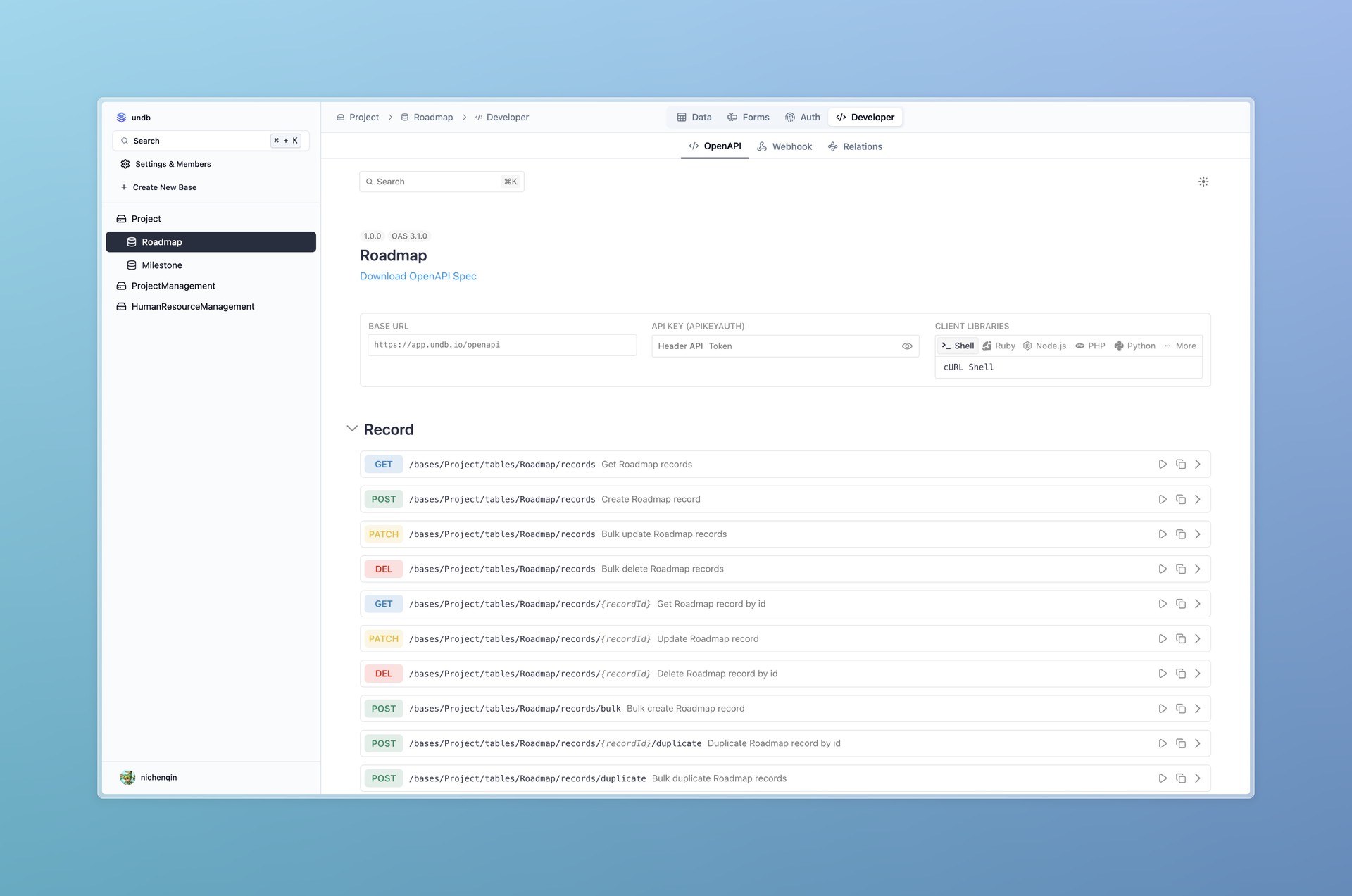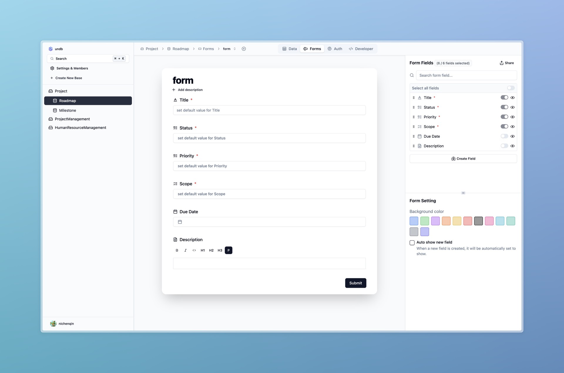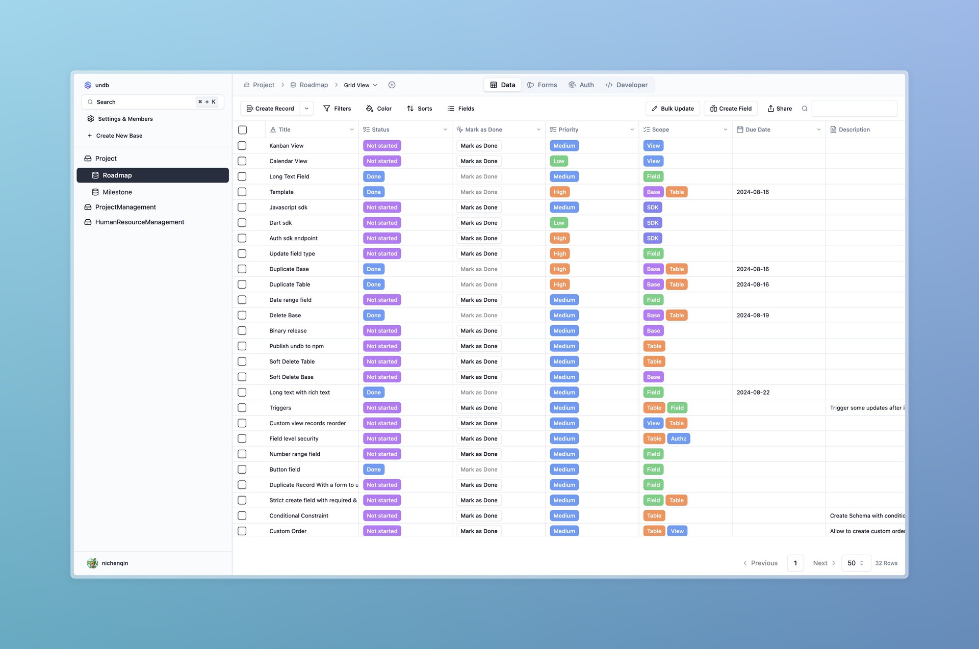 undb 不仅限于数据库管理,还支持看板视图、批量更新、记录级别安全等高级功能,适用于从个人项目到企业级应用的多种场景。未来版本将支持更多数据库集成以及自动化工具,进一步增强平台的灵活性和可扩展性。