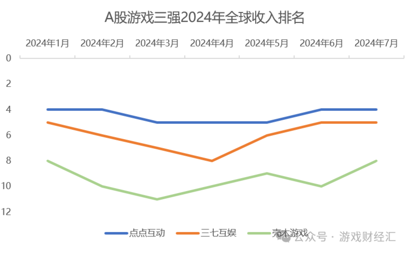 根据Sensor Tower的数据,2024年1-7月中国手游发行商全球收入榜中,世纪华通旗下的点点互动稳居前五,排名提升明显,三七互娱在第5-8名间波动,神州泰岳旗下的壳木游戏在第十名左右徘徊。
