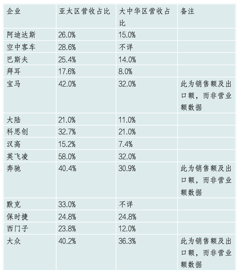 |德国部分重要上市工业企业在亚太区及中国区营收比重一览。来源:各企业2023年公开财报,德国联邦外贸与投资署整理并测算。