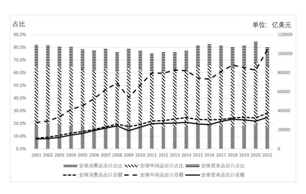 |2000-2021年中国中间品进出口总额及贸易占比。来源:联合国贸易商品统计数据库。