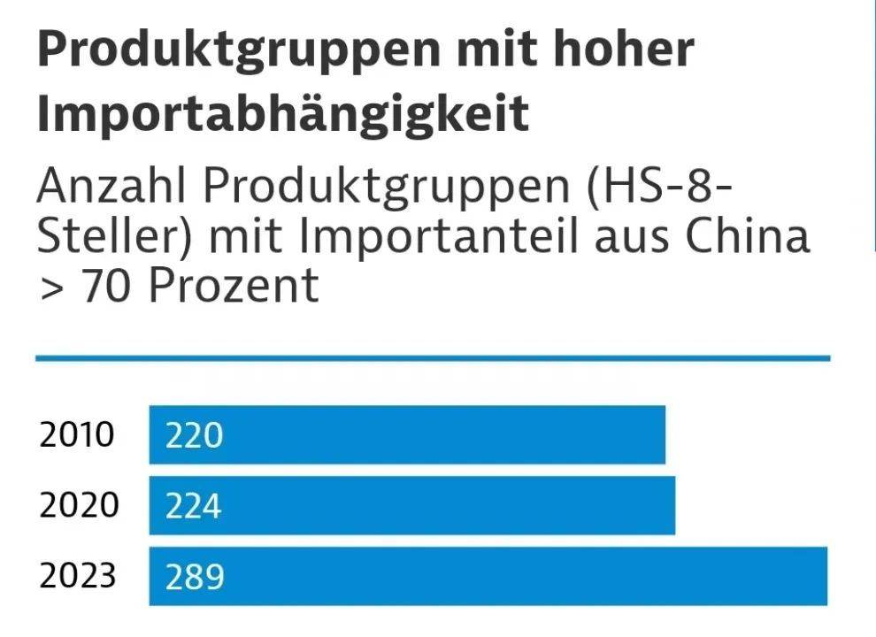 |数据显示,2010-2023年,对华进口占比在70%以上,构成极度依赖关系的产品由220种上升至289种。来源:德国联邦外贸与投资署。