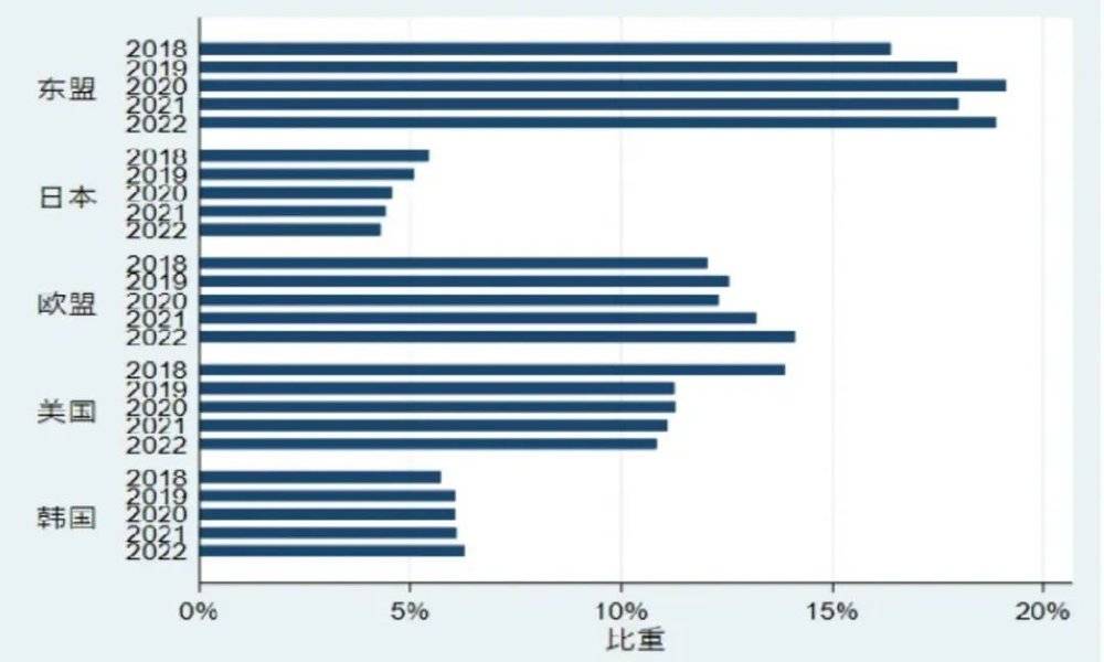 在东盟出口蕴含的外国增加值中,中国占比接连超过美国、日本、韩国,从2007年的1.6%上升至2021年的4.7%,几乎增长了2倍。