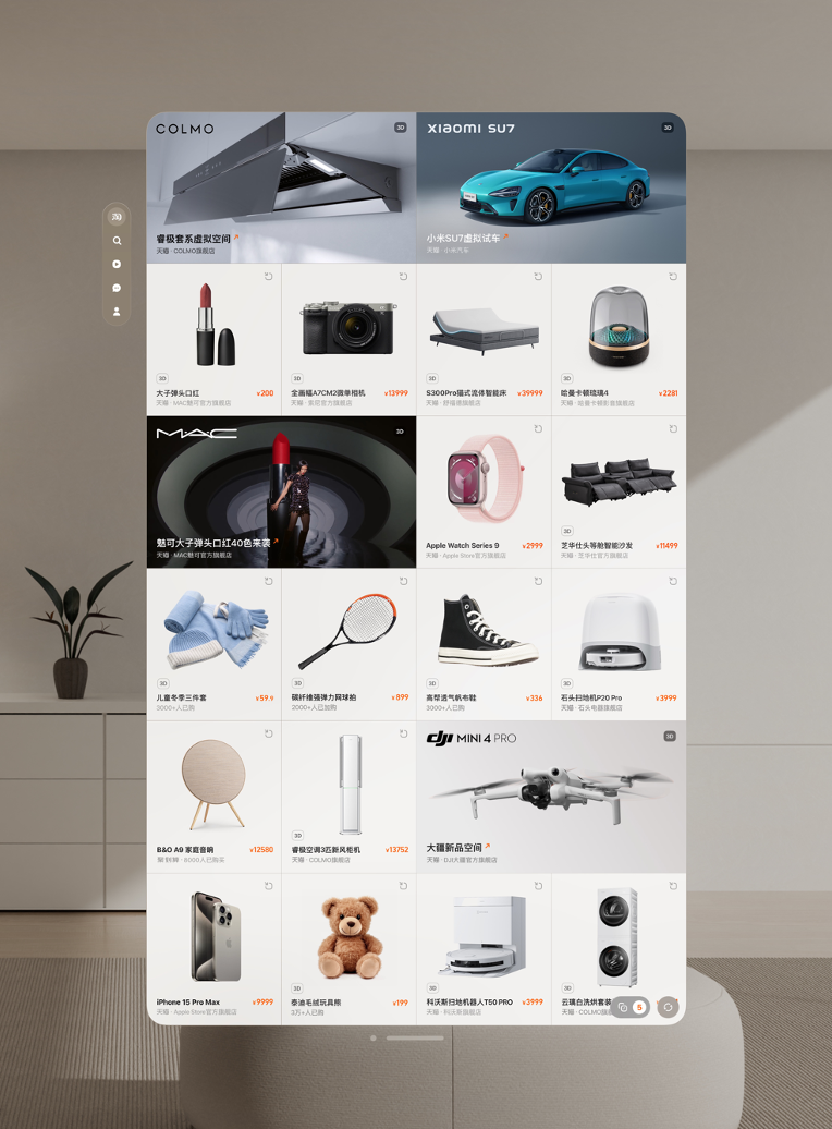 具体来看,此次版本升级后,用户登录淘宝Apple Vision Pro版,可以虚拟试驾小米SU7、“拿起”魅可的子弹头口红虚拟试色,点开哈曼的音响体验空间试听,操作大疆无人机在空中悬停,还能在COLMO品牌馆把冰箱、空调、洗碗机等商品“叠叠乐”,打造属于自己的AI生活空间。