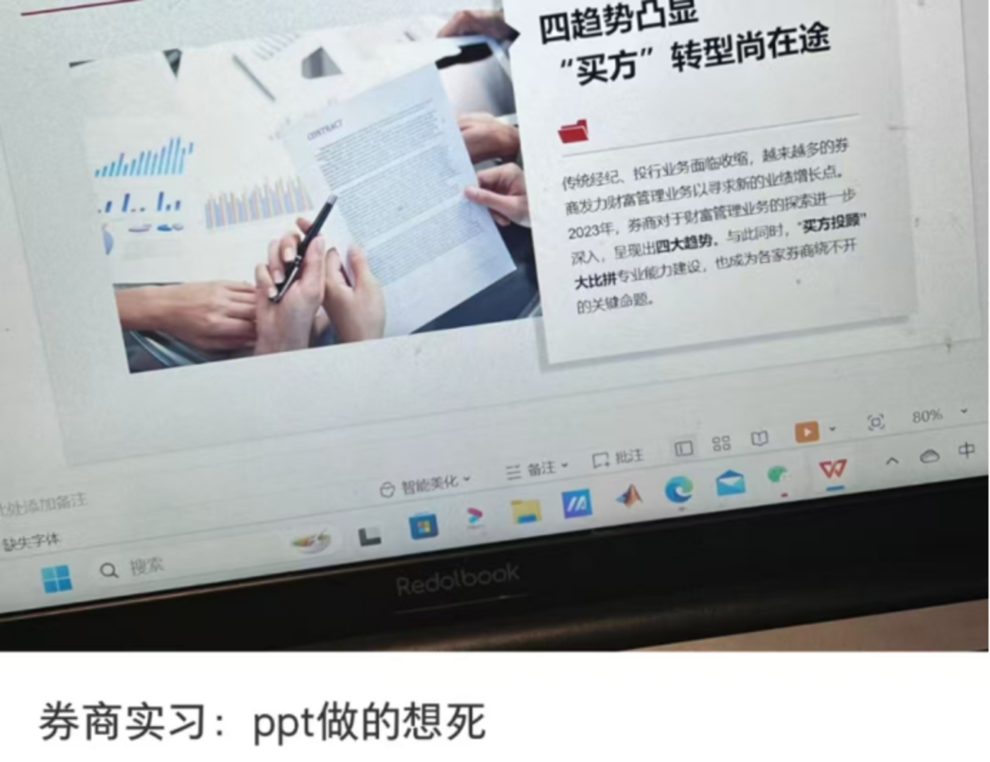 雪莉则在一遍又一遍美化PPT的过程中,体会到了行业的虚无。“本质来说,金融就是去舔更有钱的客户,让他们感受到你的专业性。fancy(精致)就是你的门面,可这并没有什么意义。专业的人在听到演讲时,就已经知道你在说些什么,并不需要漂亮的图表。”