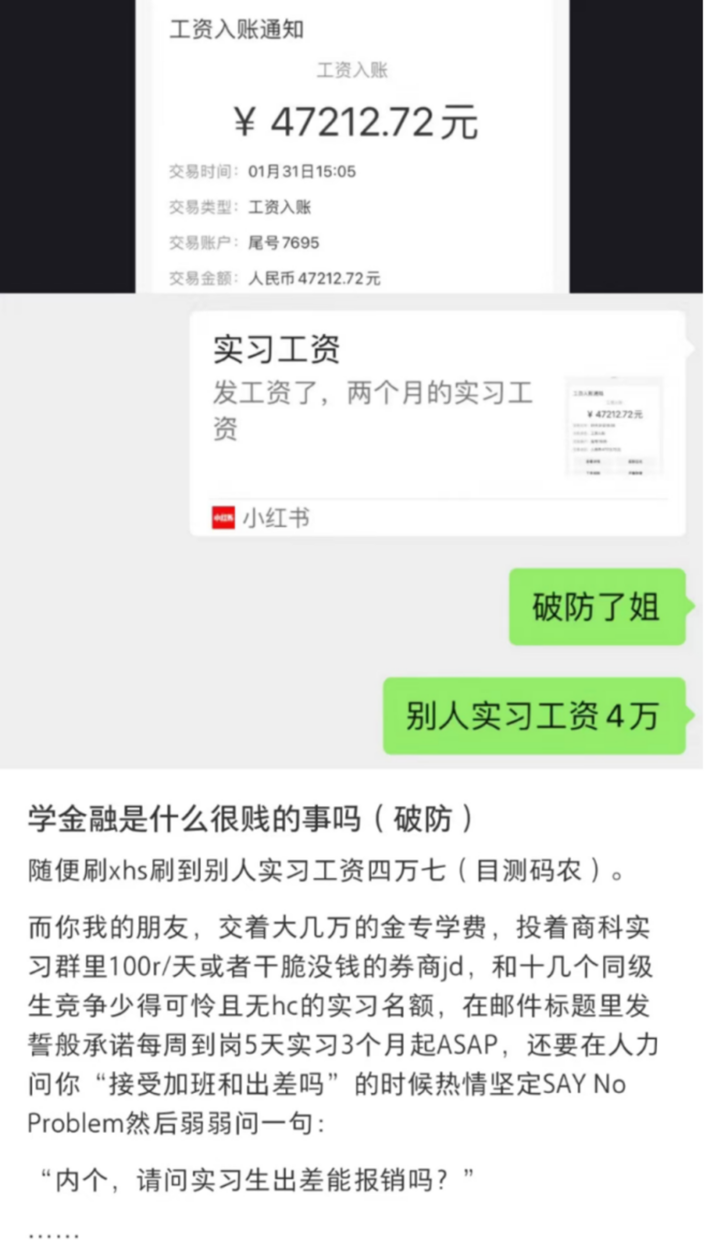 不过,即便社交媒体上,实习生们呼吁不要做免费劳动力,但卷成麻花的金融就业市场,总会有人妥协做小黑工。哪怕是“两财一贸”这样的重点院校,贴钱打工依然是普遍现象。