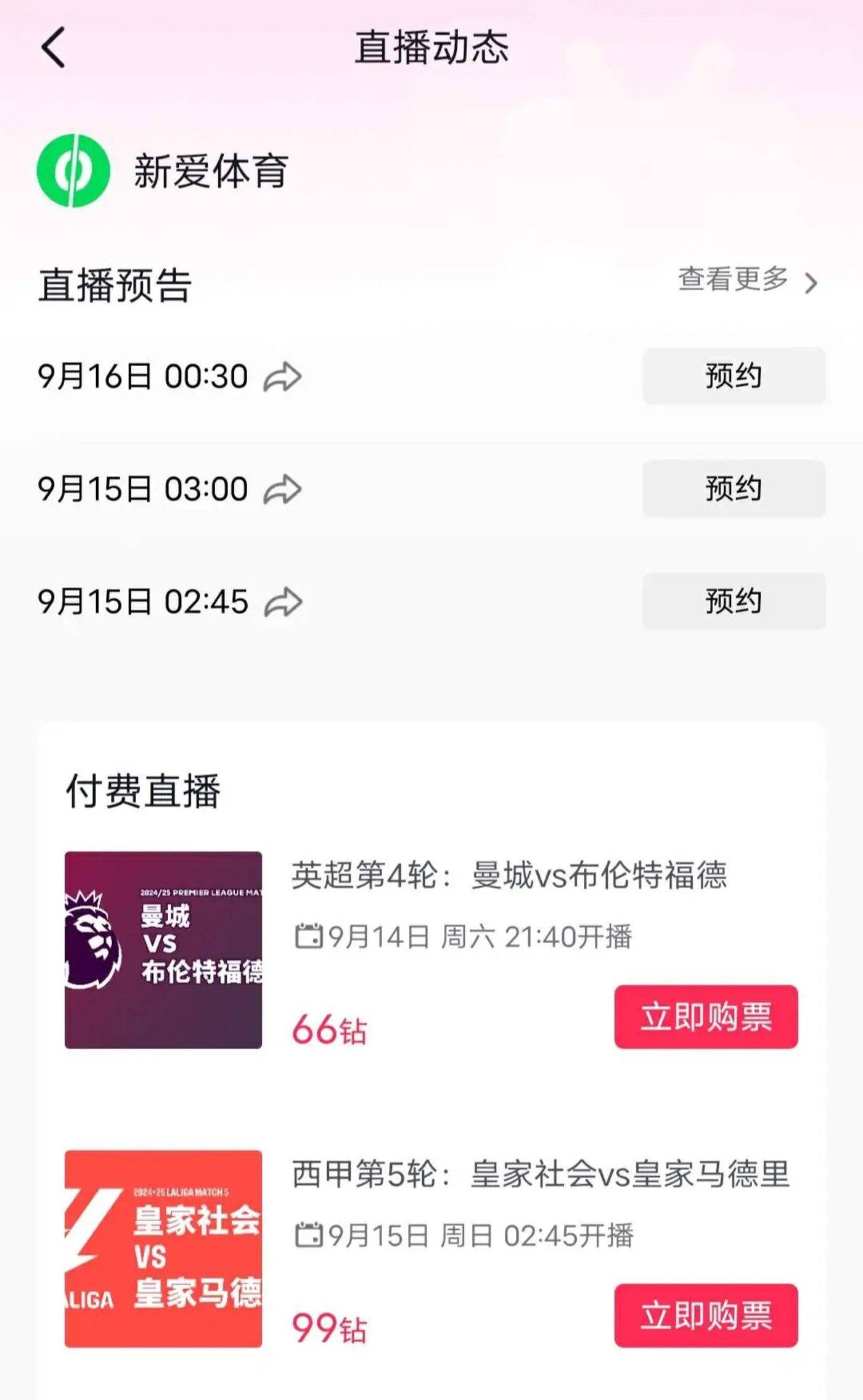 电厂注意到,去年8月以来,新爱体育抖音账号先后开启了英超、欧冠、西甲等多个赛事的直播,多数为付费观看,单场比赛设置了6.6元、9.9元两档价格。在抖音的直播体系内,普通主播与平台五五分成,像新爱体育这样手握头部体育赛事版权的机构账号,分成更高。作为参照,一位直播行业人士告诉电厂,在不考虑公会签约的条件下,头部主播分成最高可以达到七成。
