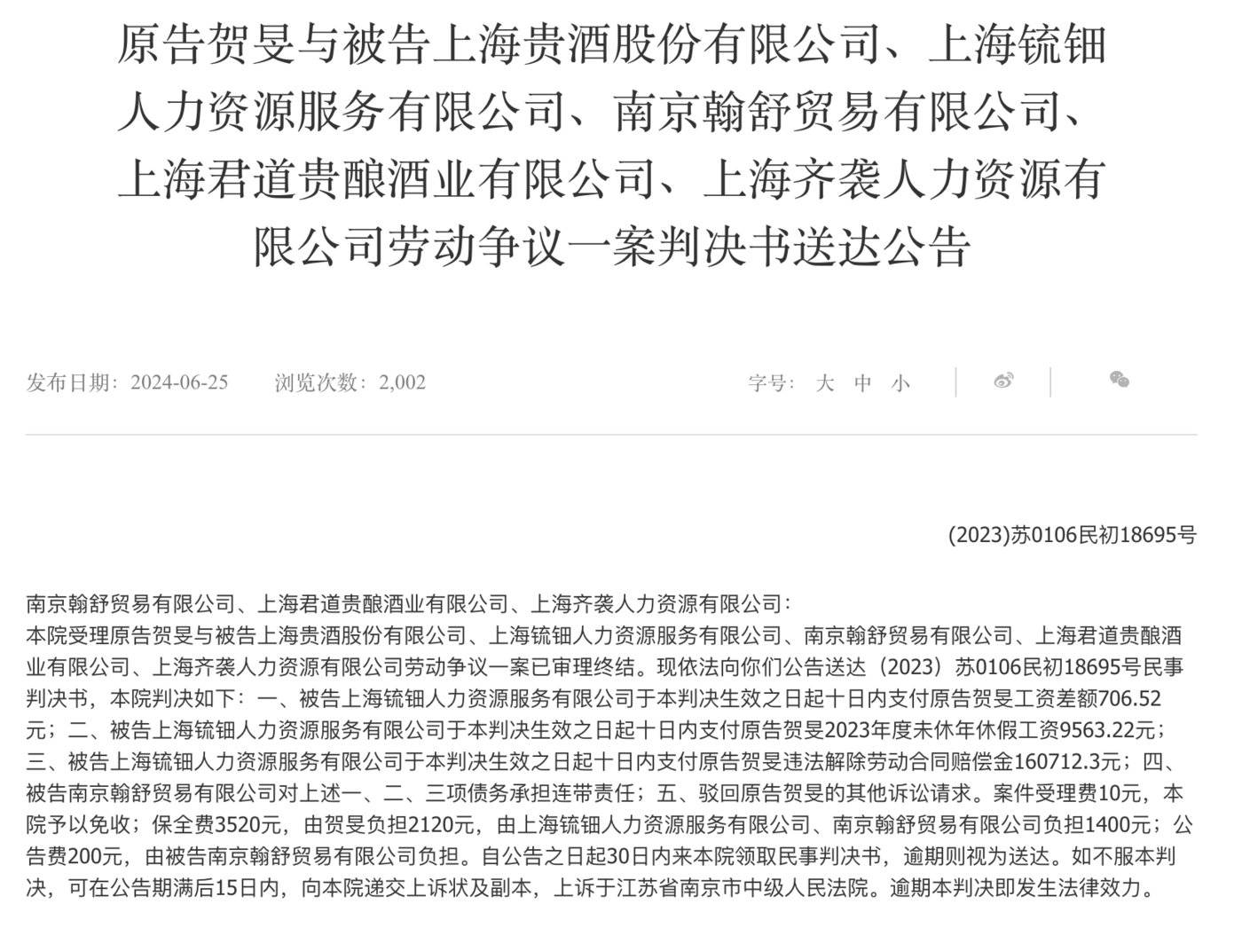 例如,在南京市鼓楼区人民法院6月25日发布的“原告贺旻与被告上海贵酒股份有限公司、上海锍钿人力资源服务有限公司、南京翰舒贸易有限公司、上海君道贵酿酒业有限公司、上海齐袭人力资源有限公司劳动争议一案判决书送达公告”中,原告贺旻的劳动争议纠纷同时牵涉四方,而除岩石股份外的其他三家公司正是此前备受争议的经销商联盟“君道联盟”的成员,该联盟曾由韩啸关联方的高管担任联席总裁,上交所曾在问询函中要求岩石股份说明是否以“君道联盟”“联盟运营平台”名义,管理22家公司的人事、财务及业务事宜。
