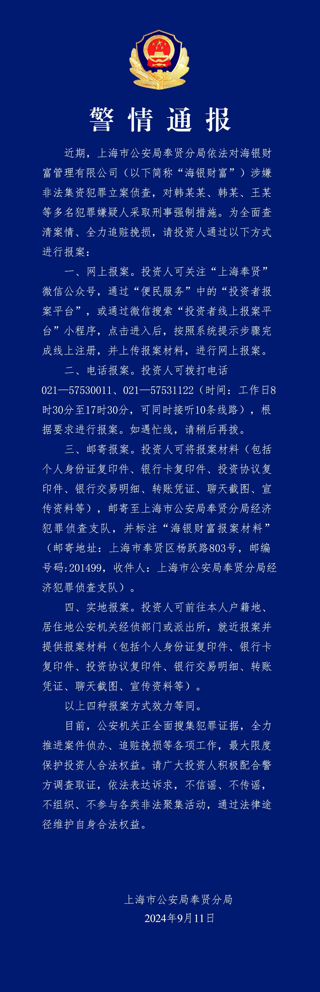 在该消息发布前,韩啸被抓一事已发酵半日,据上海市公安局奉贤分局9月11日发布的消息,近期,该局依法对海银财富管理公司(以下简称“海银财富”)涉嫌非法集资犯罪立案侦查,对韩某某、韩某、王某等多名犯罪嫌疑人采取刑事强制措施。