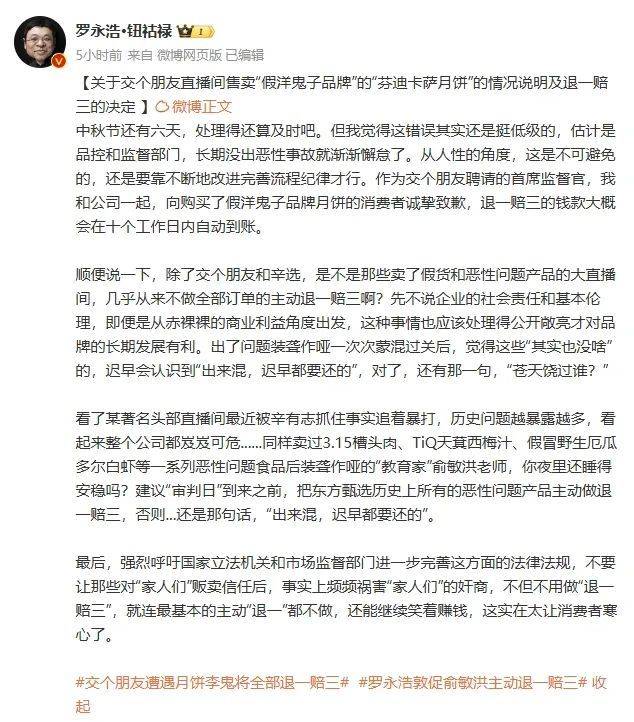9月11日早间,交个朋友直播间公开发文,称被品牌方蒙骗,遭遇“李鬼”月饼。罗永浩在其社交媒体上对此连续发文致歉,“作为交个朋友聘请的首席监督官,我和公司一起,向购买了假洋鬼子品牌月饼的消费者诚挚致歉。”