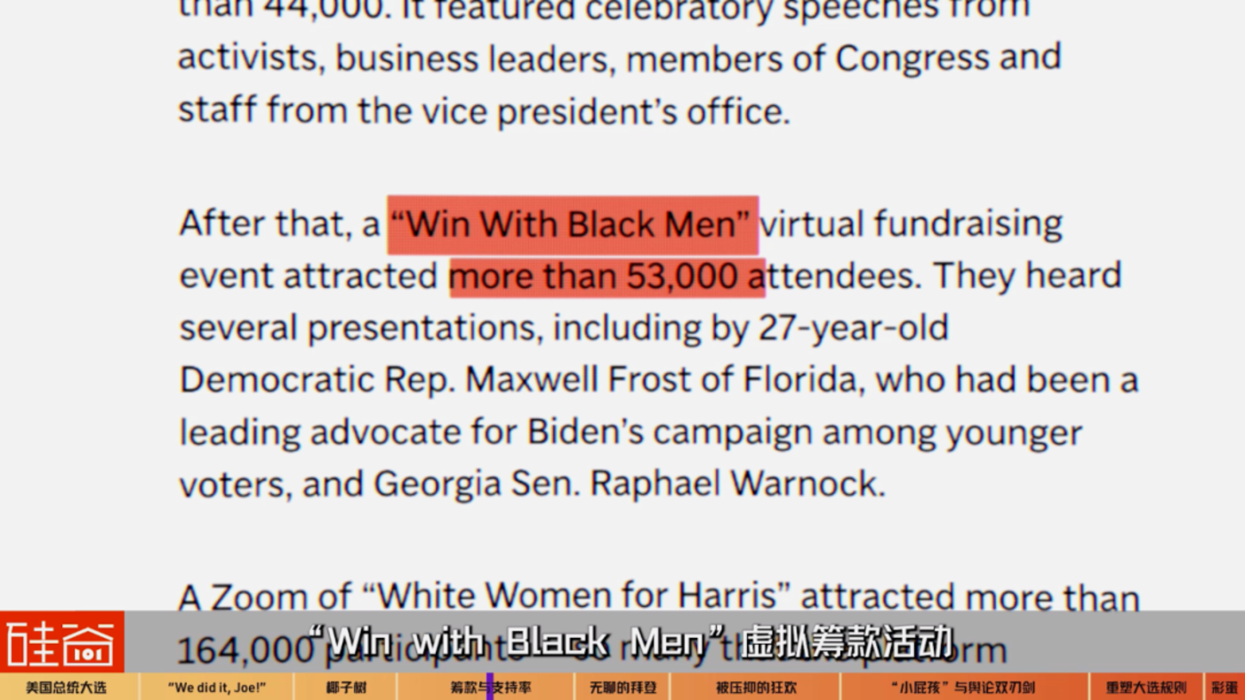 类似的,Win with Black Men虚拟筹款活动吸引了超过 53,000 名参会人,“White Women for Harris“的线上活动吸引了超过 164,000 名参与者,人数太多一度差点让线上会议平台Zoom难以满足更多人数的需求。