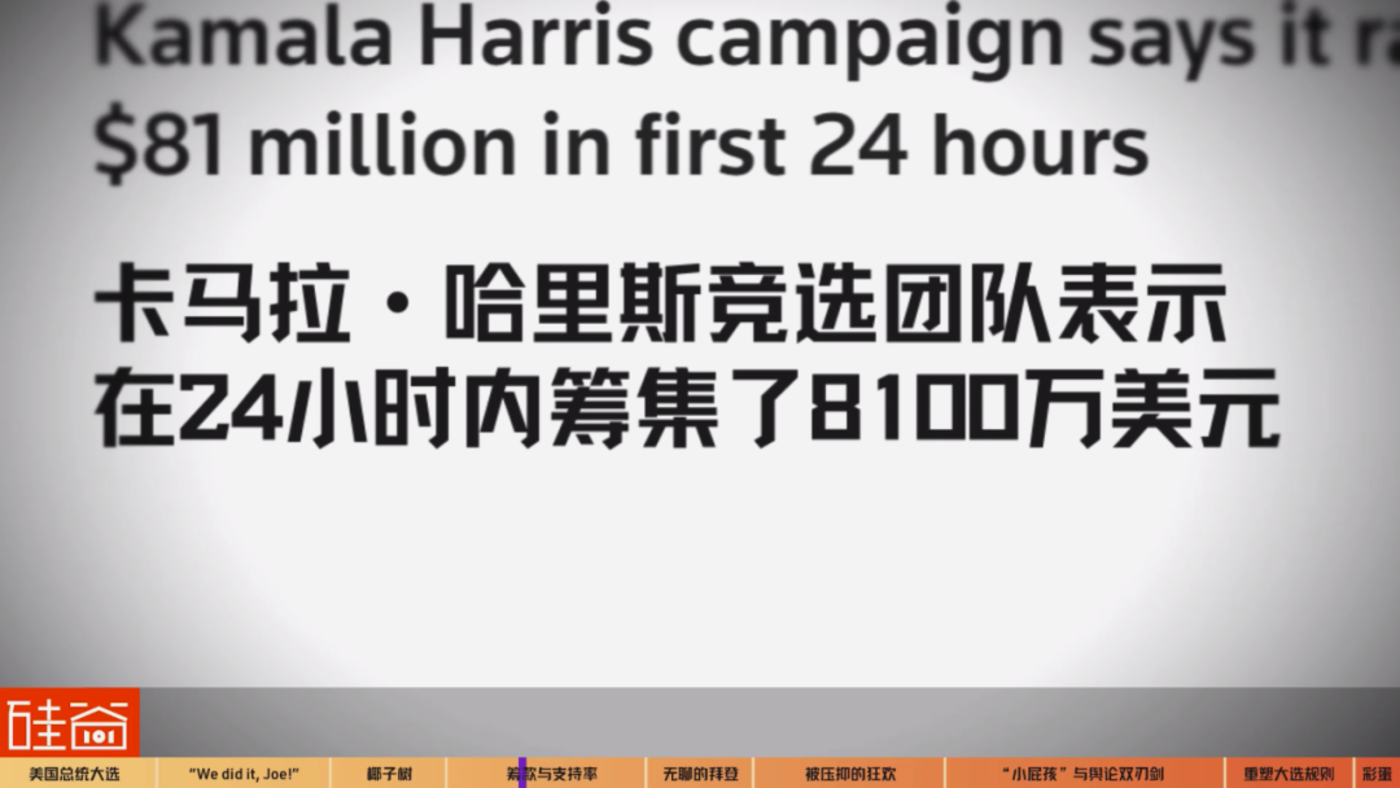 在宣布竞选总统后,Harris团队在24小时内筹集了8100万美元,创下了候选人24小时内筹集竞选资金的历史纪录。