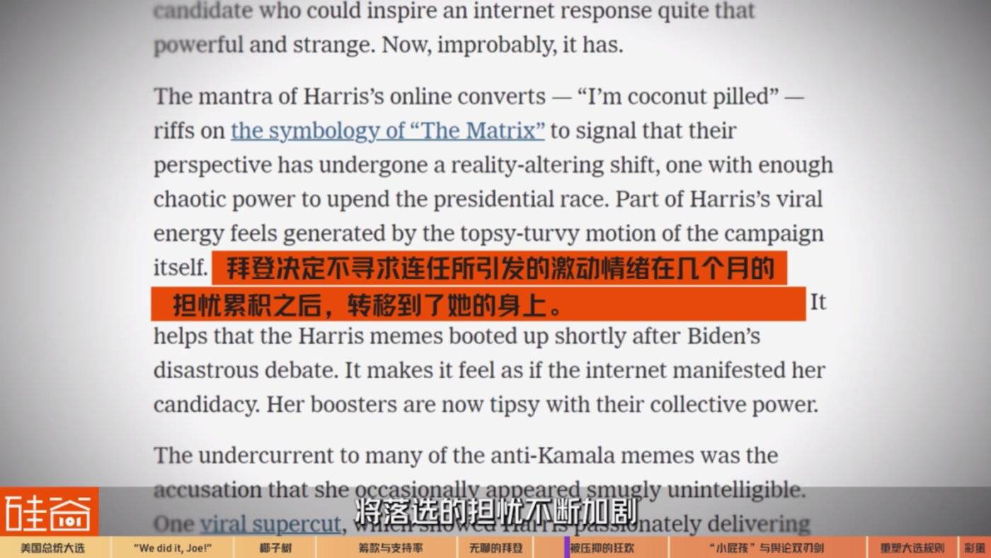 《纽约时报》分析说,在过去几个月来,民主党选民们对于拜登将落选的担忧不断加剧,而当拜登决定不再寻求连任,这种被压抑的兴奋情绪在Harris身上得到了释放。