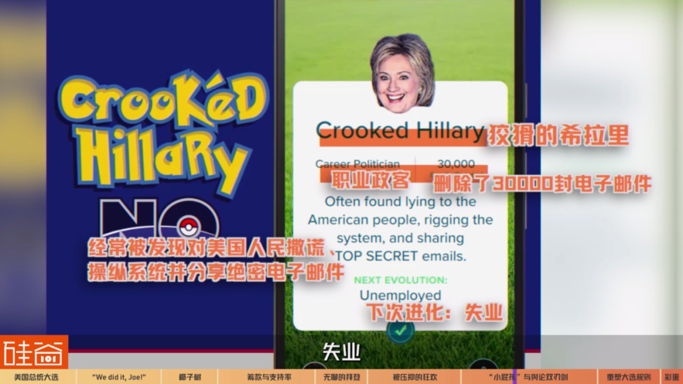 上面写着:狡猾的希拉里,职业政客,删除了30000封电子邮件,经常被发现对美国人民撒谎、操纵系统并分享绝密电子邮件,下次进化:失业。