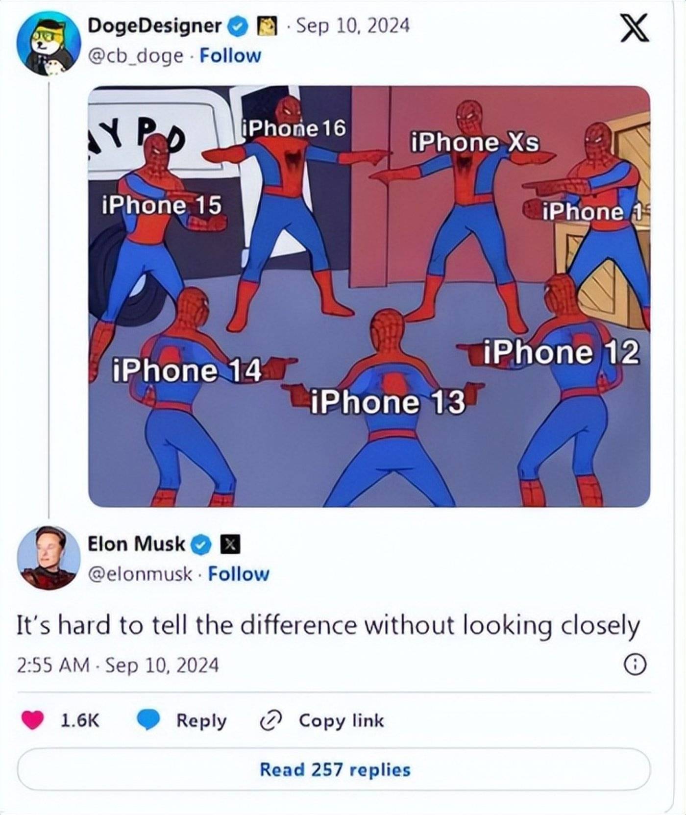 但目前来看,资本市场对iPhone 16似乎并不“感冒”。新品发布后,苹果美股盘前报价甚至下跌了1.43%。马斯克甚至在X上回应网友吐槽,暗指苹果花了500亿元,但新品却缺乏创意。