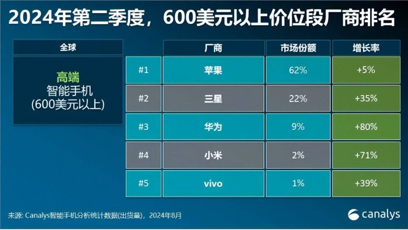 Canalys数据显示,今年第二季度,全球高端智能手机市场出货量排名前五的厂商分别是:苹果、三星、华为、小米、vivo,虽然苹果依然是市场第一,但华为正以80%的市场增速在追赶。